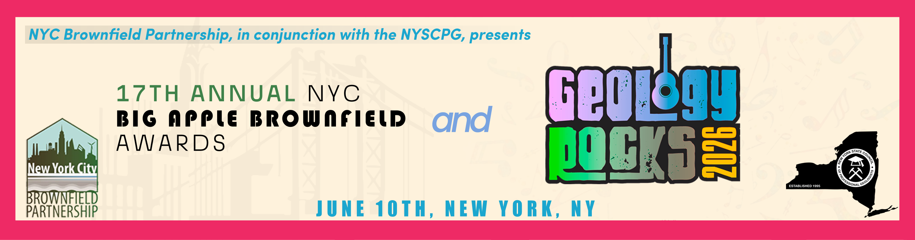 The Sixth Annual Geology Rocks EventWe invite you to join us for Geology Rocks; a networking and fundraising concert event to support the New York State Council of Professional Geologists, this year, held in conjunction with the New York City Brownfield Partnership, and their 17th Annual Big Apple Brownfield Awards. The 2026 concert represents our Sixth-annual music-themed fundraiser event, featuring music of the 80s and 90s.